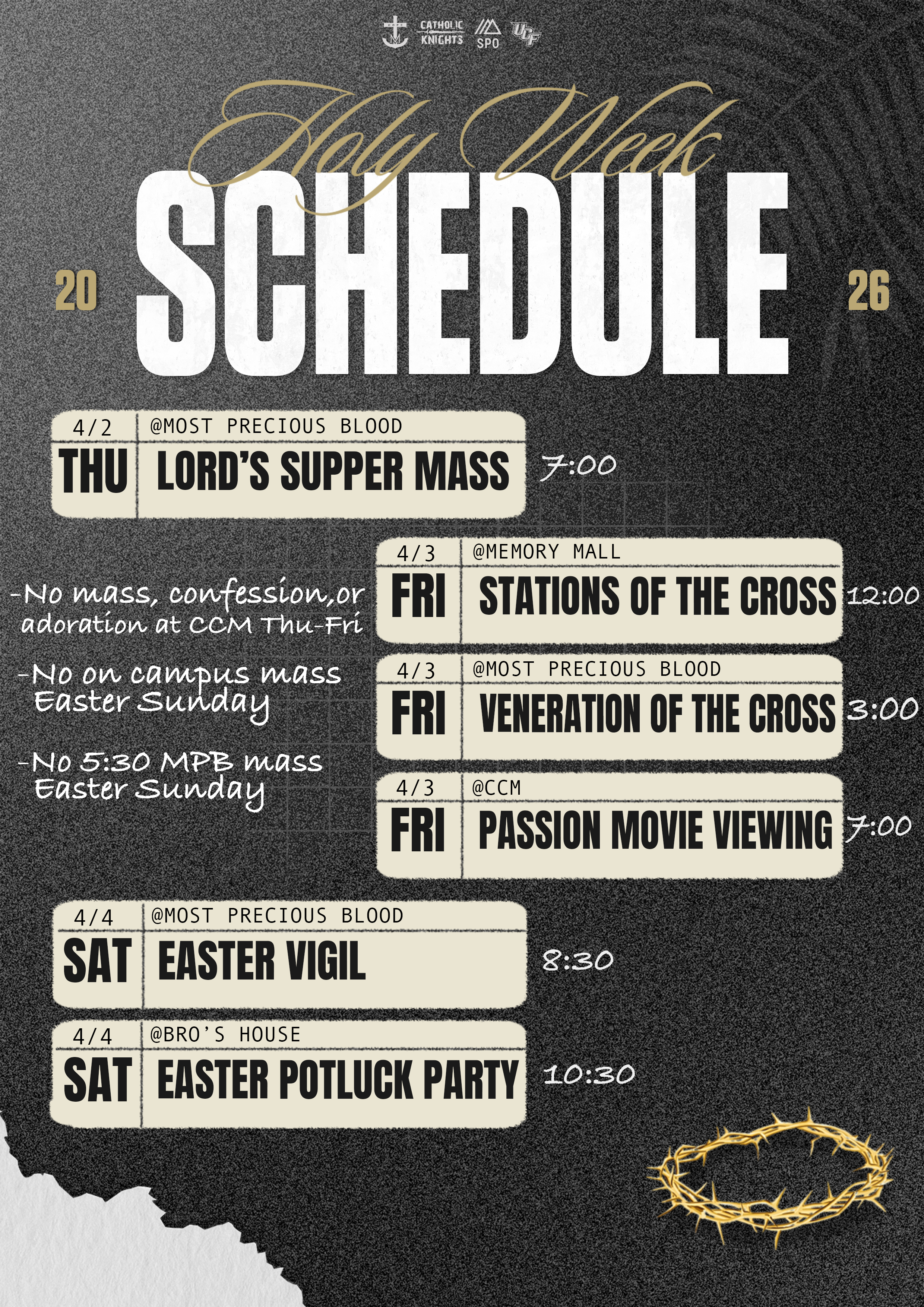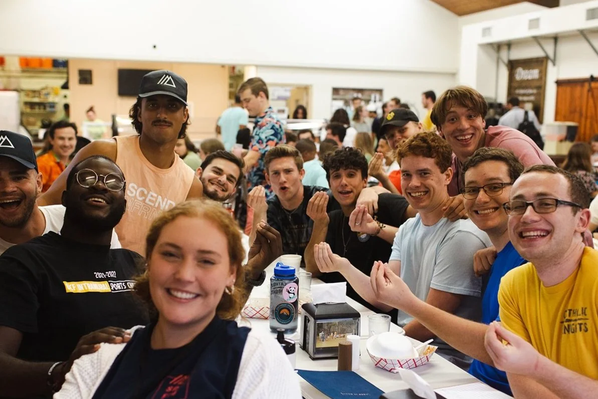 KnightFire is our weekly large group meeting led by students for students. Think of it as a mid-week retreat. There's time to hang with other Catholics, talk about what's going on in your life, sing some worship songs, and learn about your faith.